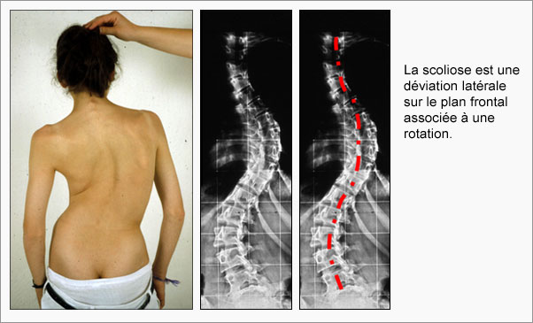 Celle-ci est créée par la rotation progressive des vertèbres : la colonne vertébrale déviant vers la droite ou vers la gauche, chaque vertèbre qui constitue cette déviation va peu à peu se tourner sur elle-même afin de suivre la courbure. La scoliose conduit l’individu qui en est atteint à « pencher » vers le côté vers lequel dévie la colonne. Mais en dehors de cet aspect inesthétique, la scoliose peut avoir des répercussions sur les organes internes : la mauvaise position de tout le buste peut exercer des pressions sur les poumons voire même sur le cœur : se produisent des insuffisantes respiratoires et des problèmes cardiovasculaires. Des douleurs peuvent aussi se produire, elles sont assimilables à des douleurs rhumatismales.