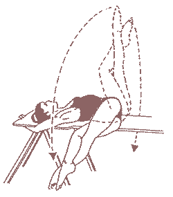 Par exemple, si on est avec les bras accrochés en chandelier aux coins de la table, la tension d’étirement initiée par la bascule latérale des jambes (et éventuellement du bassin) remonte jusqu’aux épaules et à la nuque.