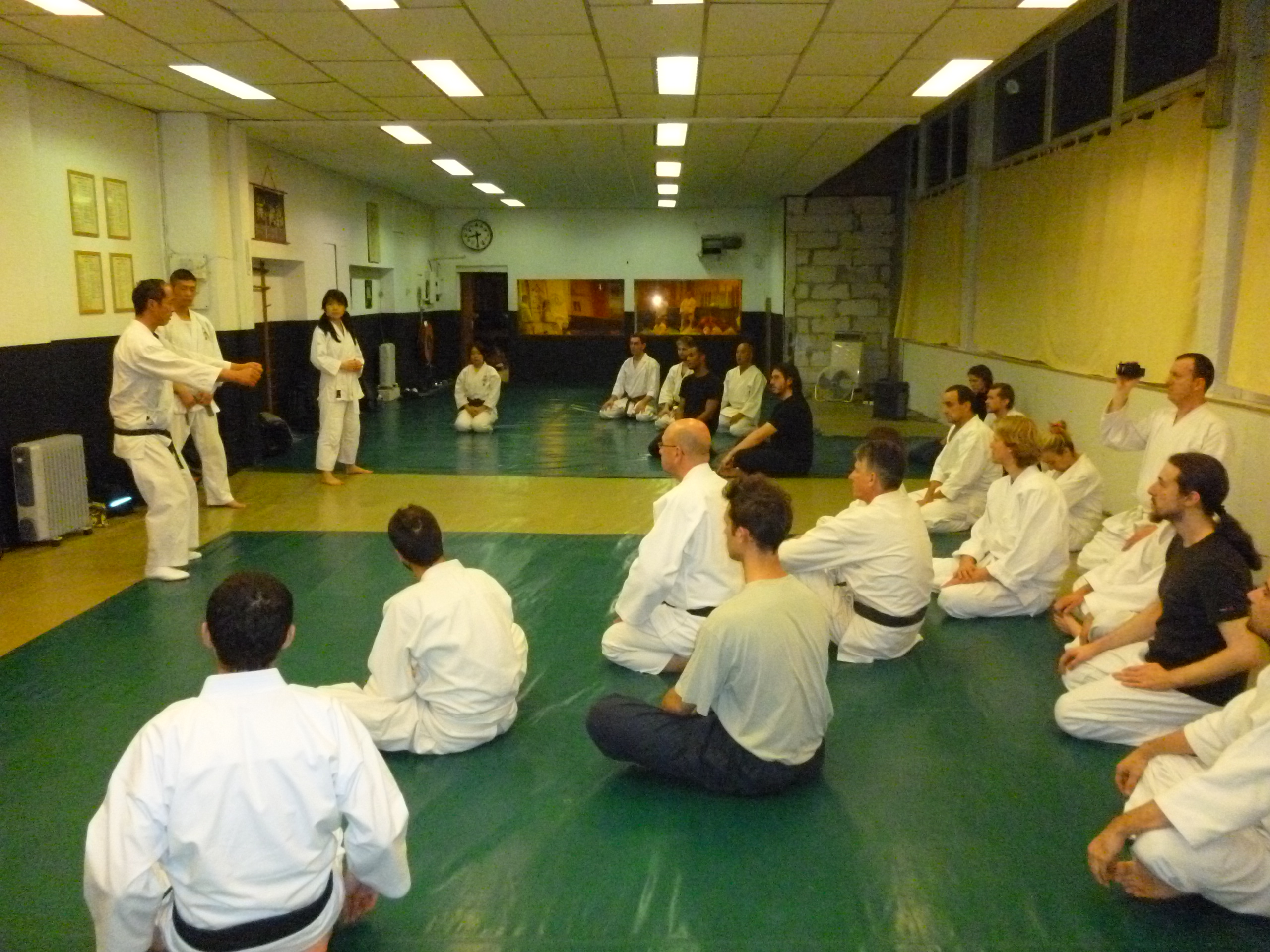 La présence de Takako, une pratiquante de kendo d’origine japonaise, comme traductrice à poussé senseï dans des explications sur sa méthode. Explications qui malheureusement, avec tous les efforts de traduction n’ont pas pu profiter aux stagiaires pour cause de difficultés de compréhension des principes propres à la méthode et du vocabulaire.  Alourdissant la première soirée en rendant l’approche de l’Aunkai encore plus difficile.