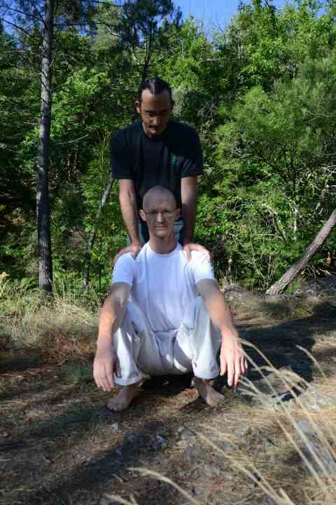 Plusieurs exercices d’aunkai consistent à se relever d’un position accroupie. Ici aussi, bien sûr, alors que l’on s’élève sur un axe arrière (en déséquilibre arrière) les épaules sont détendues, la colonne reste verticale et toute la force descend dans les aines (kuas). Aucune tension dans les jambes, surtout pas dans les genoux et la force s’écoule entre les omoplates, le long de la colonne et dans les jambes. On peut travailler cet exercice avec la résistance d’un partenaire sur les épaules, voire en essayant de le lever.