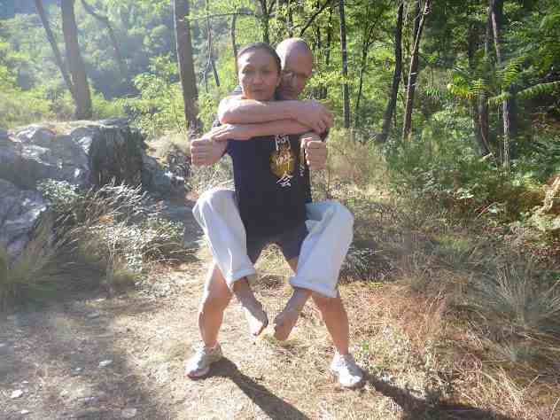 3. poser les bras par les épaules sur le buste et le buste dans les hanches. Les mouvements des bras levés et le maintien génèrent une tension dans les épaules que l’on relâche dans un premier temps, mais qui se détendent vraiment lorsque l’on « pose » les épaules sur le buste. La sensation d’une détente qui s’écoule relie les bras et la structure, l’axe central. Pareillement, dans les mouvements de lever de jambe (ashi age ou shiko), c’est lorsqu’on se pose dans la hanche (kua) que la jambe monte plus librement et sans effort, autour de ce point de rotation. On l’expérimente dès les premières longues minutes en maho : il faut réellement s’asseoir en arrière pour libérer les cuisses et éviter qu’elles brûlent sous l’acide lactique. Cette sensation de poser le corps induit un amortissement des poussées qui donne de la stabilité à la posture et permet d’absorber les poussées de partenaires.