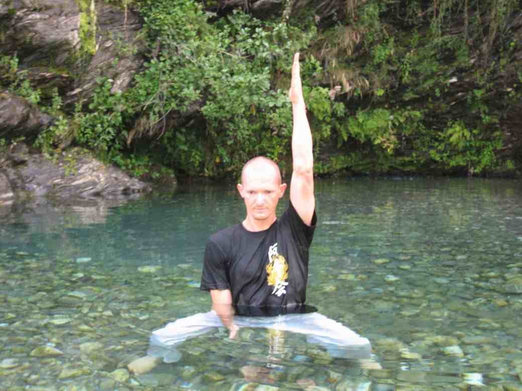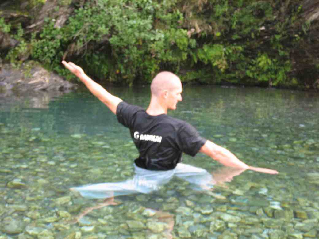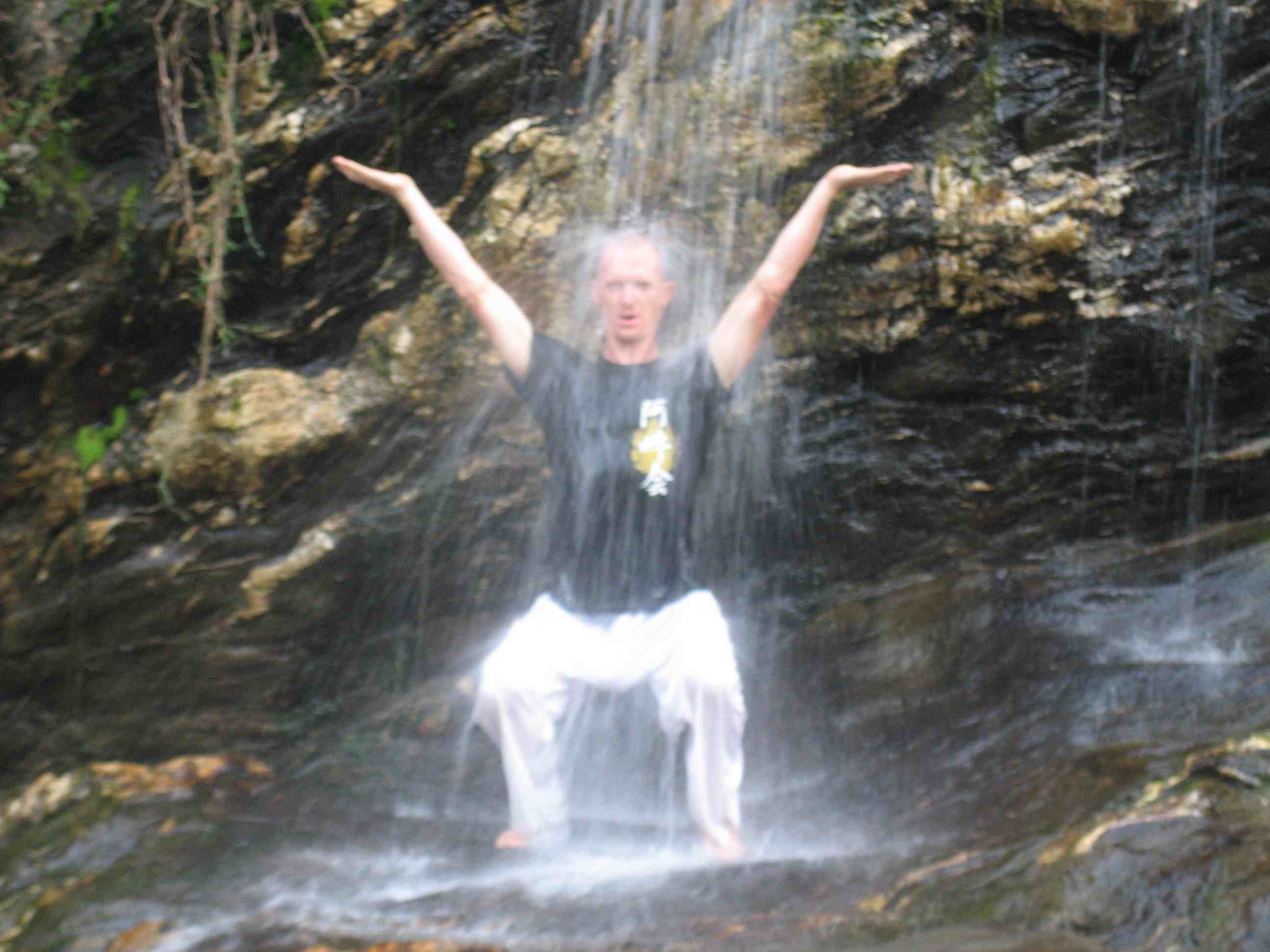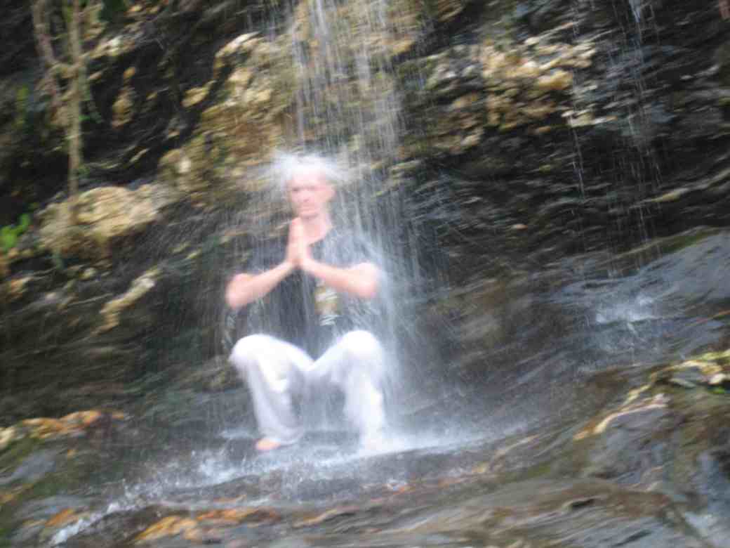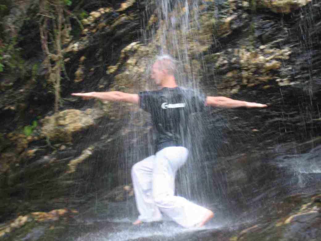 L’eau en chute permet de jouer avec les positions et de les tester. Elle accroit la pesanteur qui nous traverse uniformément. Utiliser la cascade de façon localisée permet de développer et affiner des sensations. Sur shintaijiku, comme dans tenchijin, elle permet de renforcer l’axe central, son étirement et la qualité de son amorti.