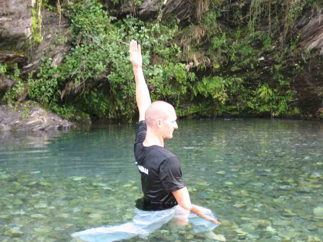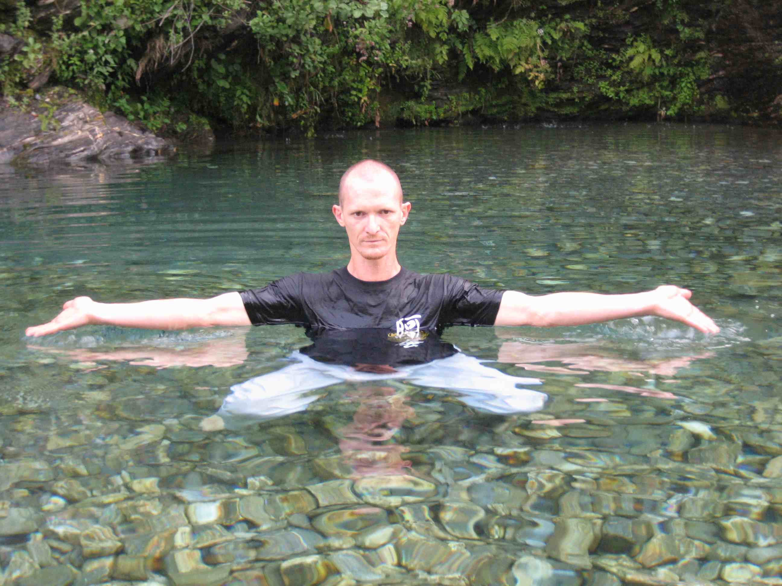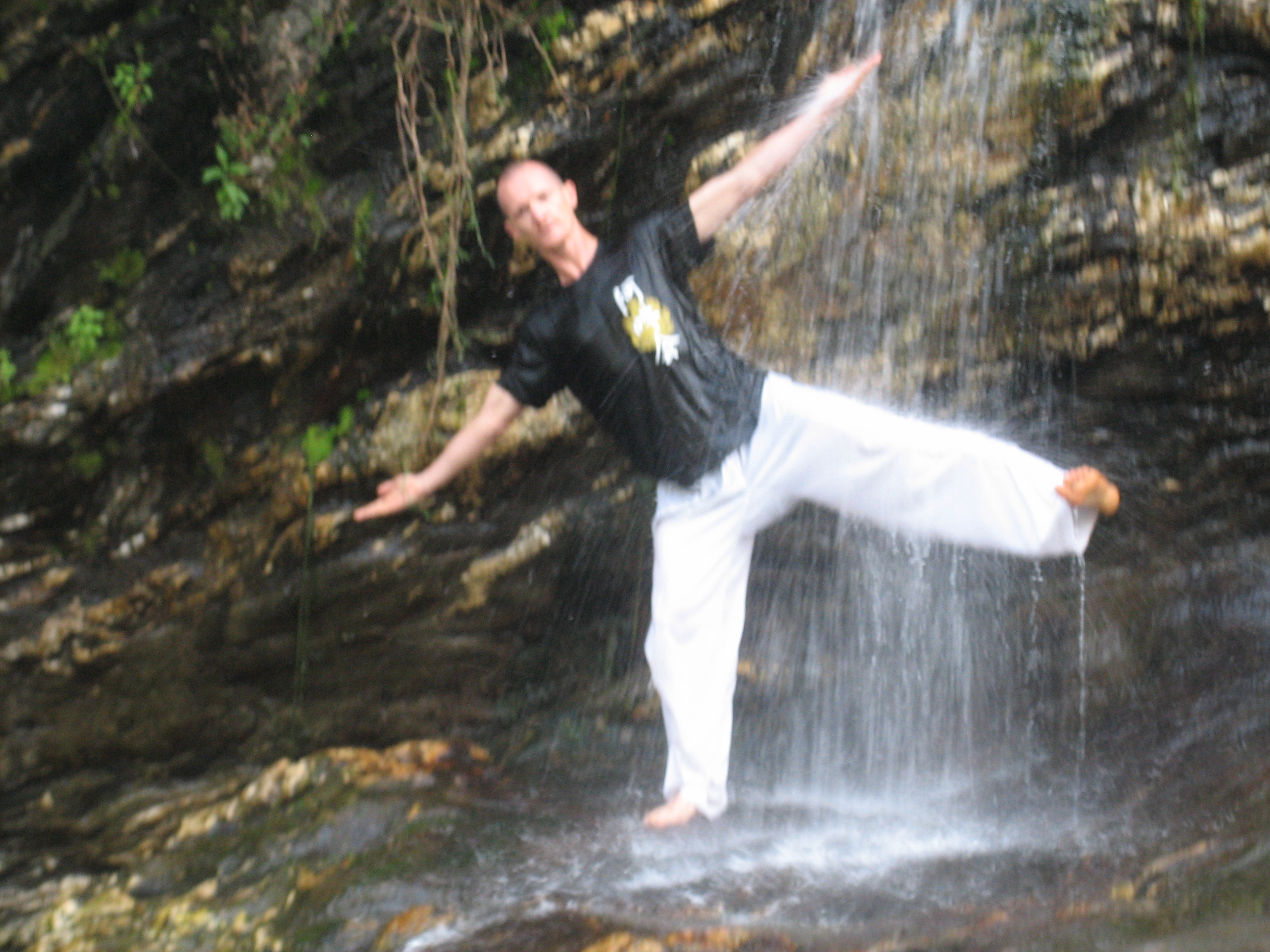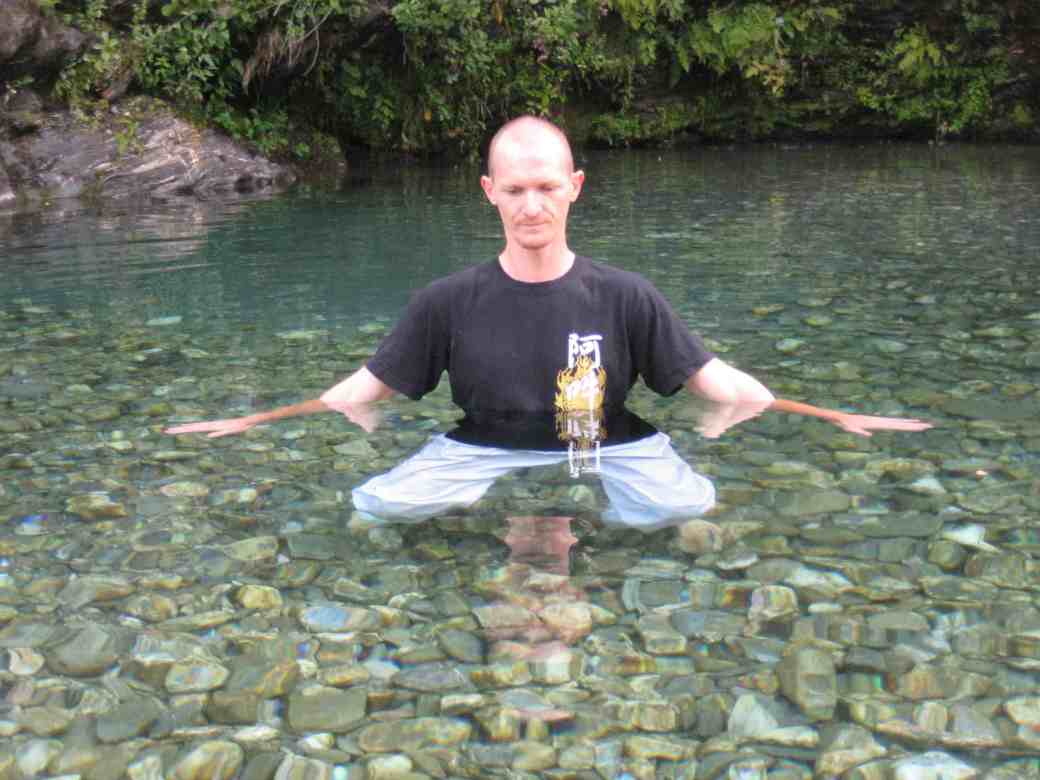 L’eau en chute permet de jouer avec les positions et de les tester. Elle accroit la pesanteur qui nous traverse uniformément. Utiliser la cascade de façon localisée permet de développer et affiner des sensations. Sur shintaijiku, comme dans tenchijin, elle permet de renforcer l’axe central, son étirement et la qualité de son amorti.