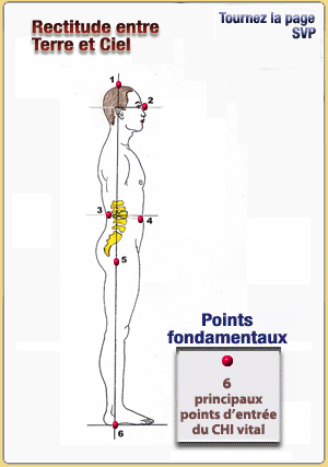 L’importance d’un bon alignement, de la tête aux pieds était recherché dans la pratique taoïste en Chine comme ailleurs. Sur l’image qui suit cet alignement précise, les six principaux points d’entrée de l’énergie vitale. Notez le Yang du Ciel versus le Yin de la Terre.
