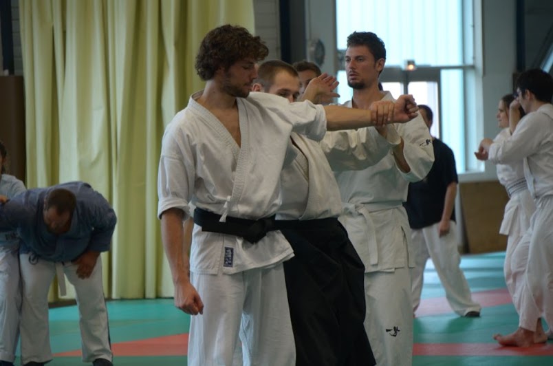 Les premiers exercices sont des basiques : une saisie de l’avant-bras de l’autre, avec le contact qui se développe le long de la paume. Amener uke au sol.