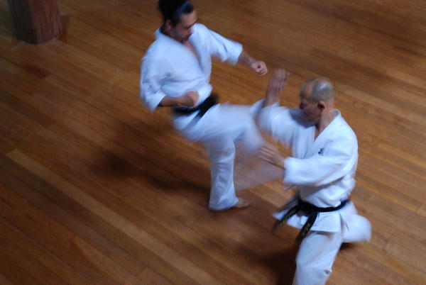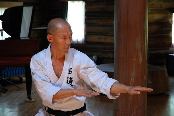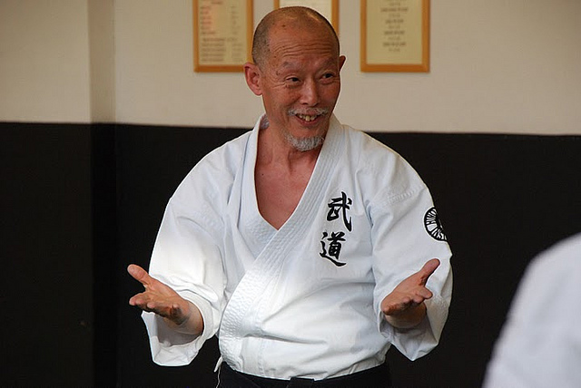 Hino sensei commence par expliquer aux nouveaux que son enseignement vise à utiliser le corps dans son ensemble. Que le sternum implique la colonne, le bassin, les articulations… Qu’il a 64 ans, que son corps fonctionne mieux qu’il y a 20 ans et que dans dix ans, il fonctionnera mieux encore :« plus on prend de l’age, plus on devient fort ».