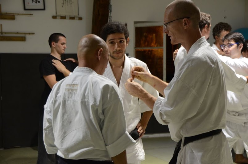 – sur une poussée ou un tsuki (qui touche ou qu’on esquive) on s’enroule le long du bras qui pousse, jusqu’à entraîner Uke en chute (une sorte d’ippon seoi nage, le long de notre clavicule). Hino sensei dit de ne pas reculer, de garder le contact, de le dérouler point par point. Ne pas tirer, ne pas pousser.
