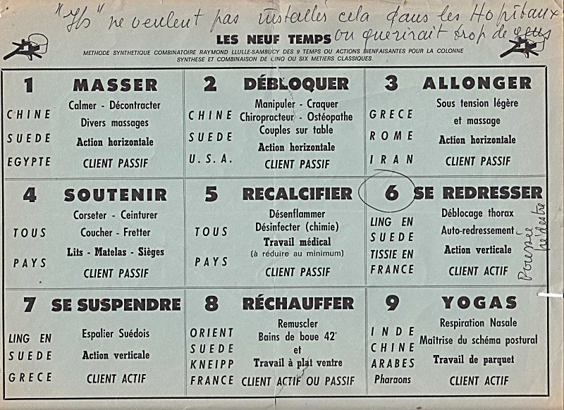 Voici les neuf temps, successifs ou simultanés du traitement de la colonne vertébrale ruinée, du dos douloureux et faible, effondré, mou ou contracturé en cordes :